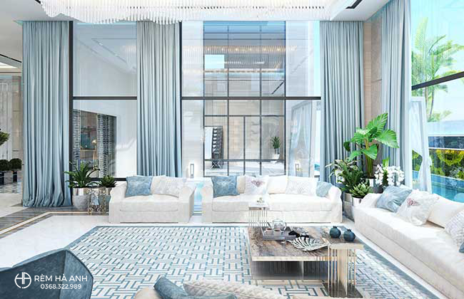Với phòng khách, nên lựa chọn những mẫu rèm có phong cách sang trọng, thanh lịch và tươi sáng. Bởi nó sẽ giúp gia chủ phô diễn gu thẩm mỹ, sự giàu sang của mình. Đồng thời, chất liệu rèm phòng khách biệt thự không cần quá kín đáo. Vì đây là không gian có thể tận dụng ánh sáng tự nhiên để tạo sự thông thoáng, dễ chịu.